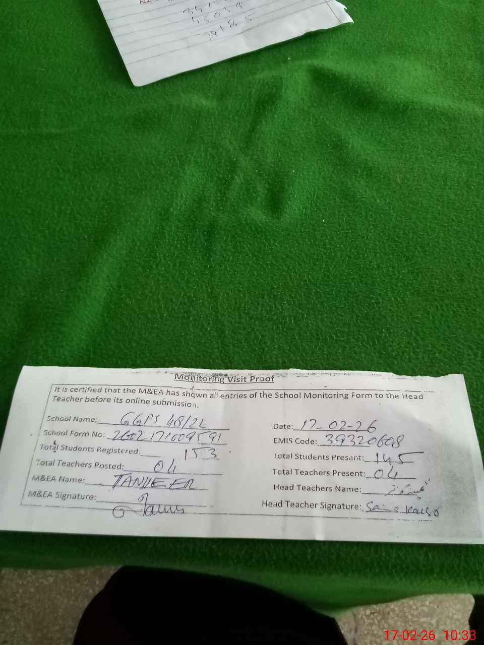 | Attendance Register | Head Teacher | MEA with School | Visit Proof |