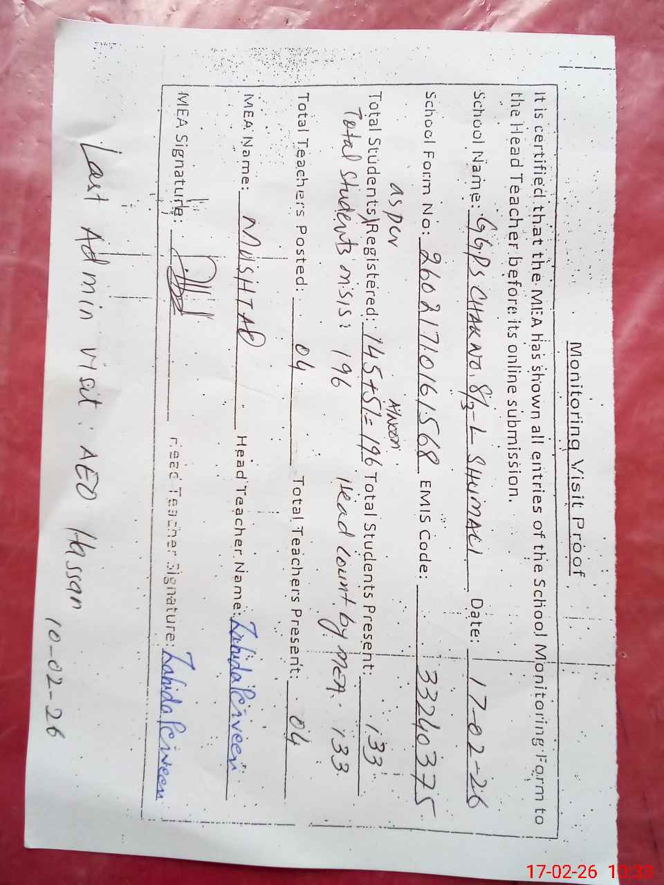 | Attendance Register | Head Teacher | MEA with School | Visit Proof |