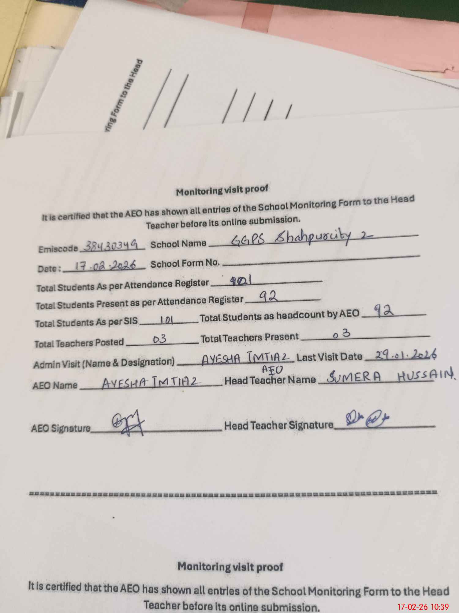 | Monitoring Date: 17-02-2026 | Start Time: 17-02-2026 10:01 AM | End Time: 17-02-2026 10:39 AM | Name of MEA: AY**** IM**** | |