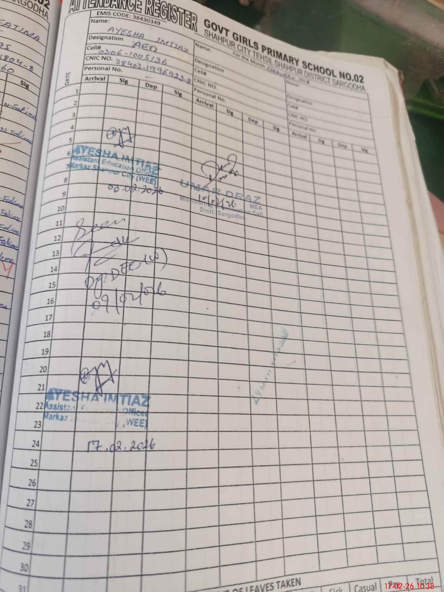 | CNIC | Full Name | Designation | R/C | Absence during last cal. month |