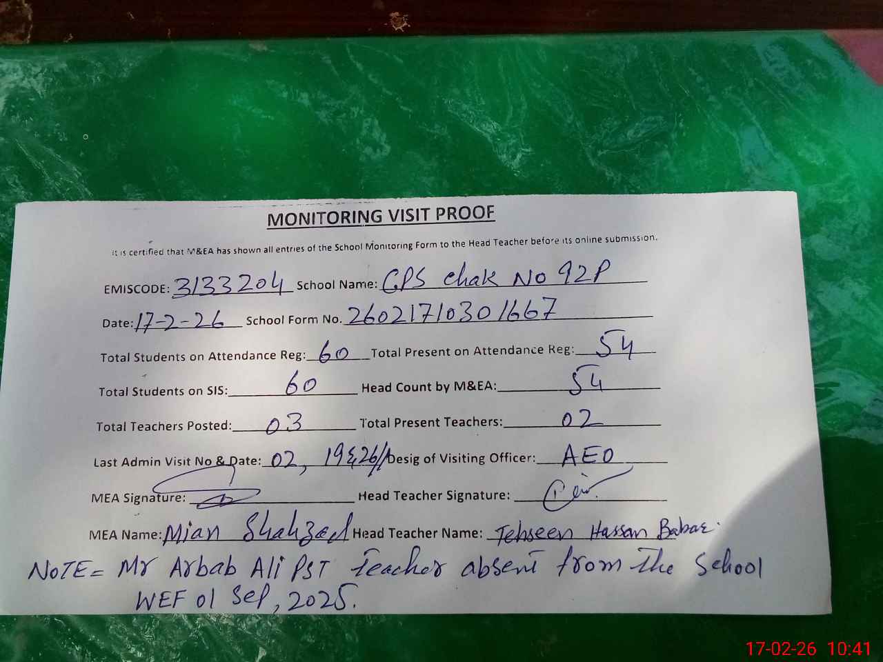 | Remarks (Use Separate Page if Required): Mr Arbab Ali PST teacher absent from the school WEF 01 September 2025. | |||||
