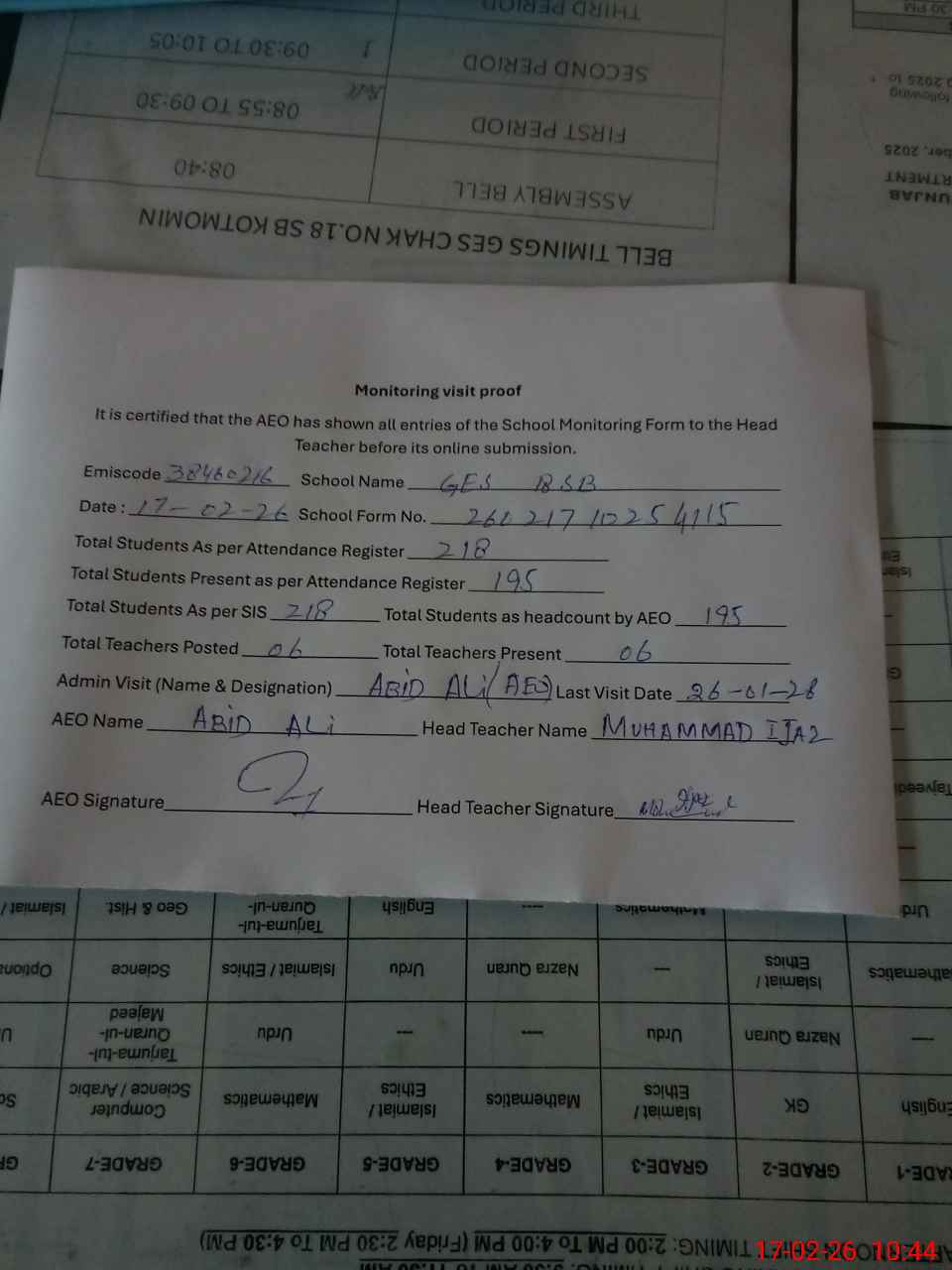| Certified that this School was Inspected by the Undersigned MEA/DMO Today and the Information Stated Above is as Per Record. | |||||