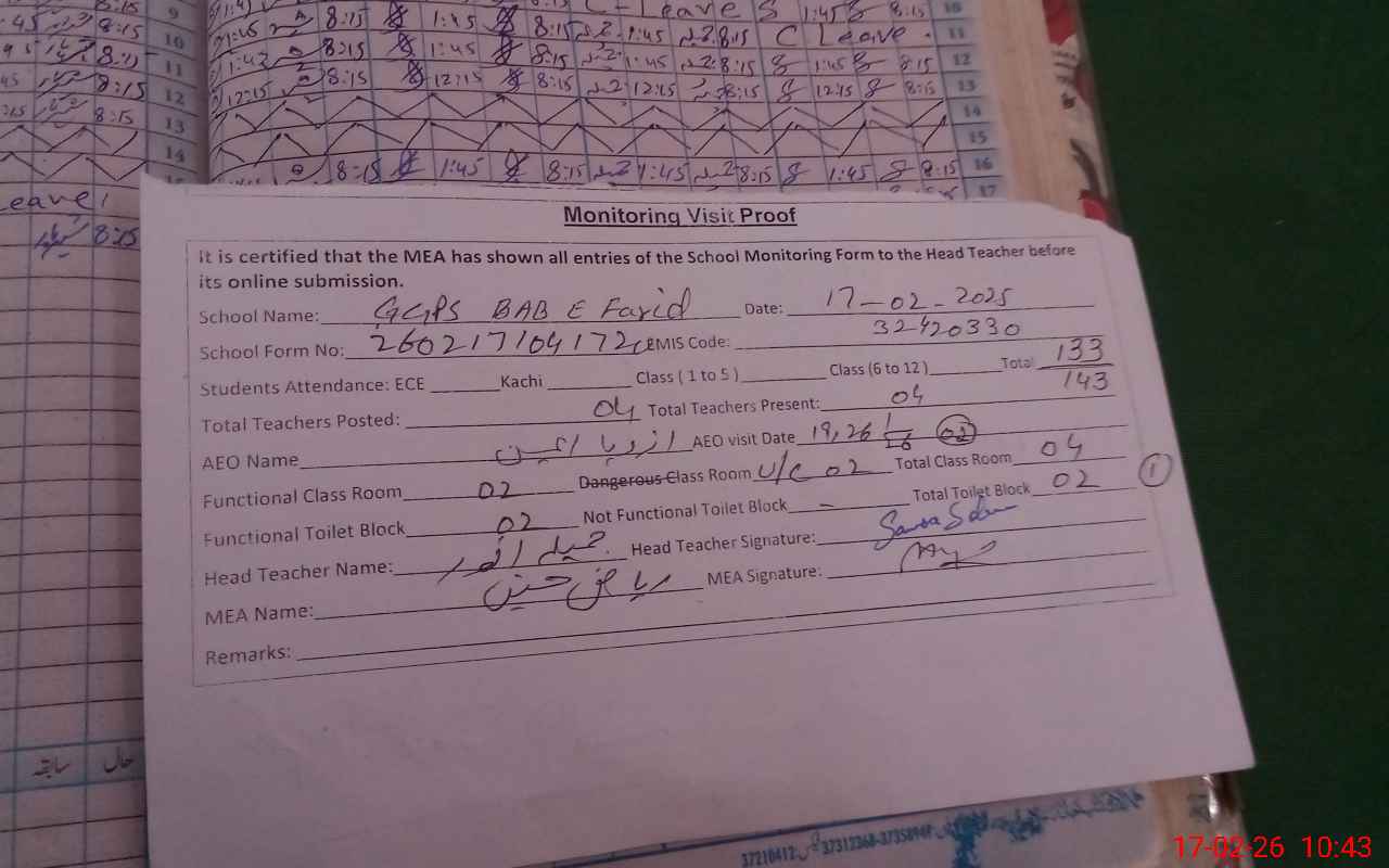 | EMIS Code: 32420330 | Name of School: GGPS BAB-E-FARID | |||
