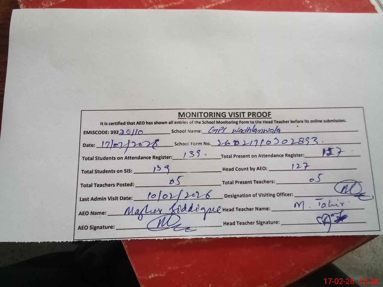 | EMIS Code: 38220110 | Name of School: GPS WADHLAN WALA | |||