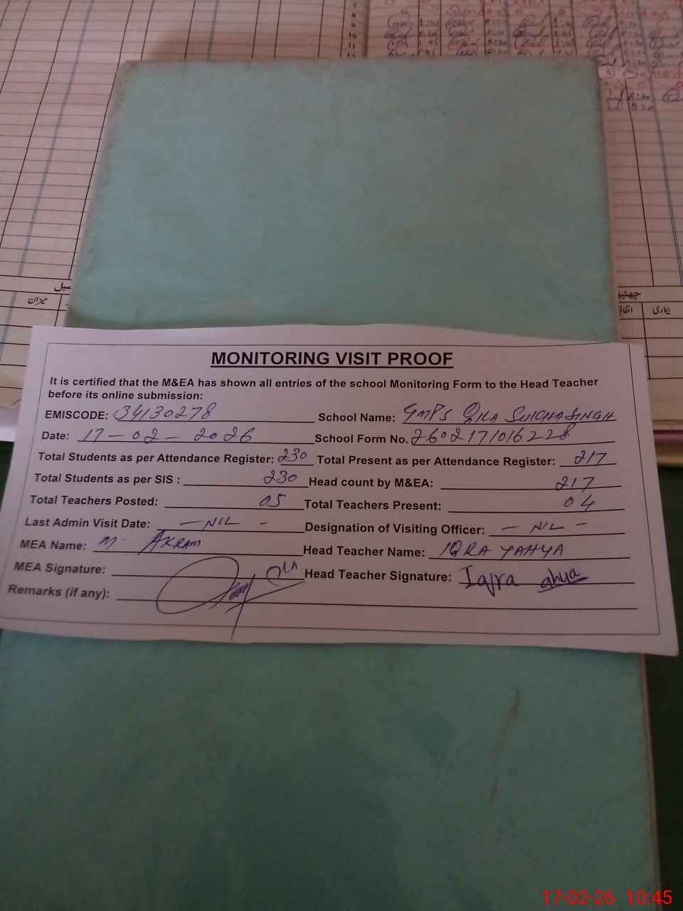 | Attendance Register | Head Teacher | MEA with School | Visit Proof |