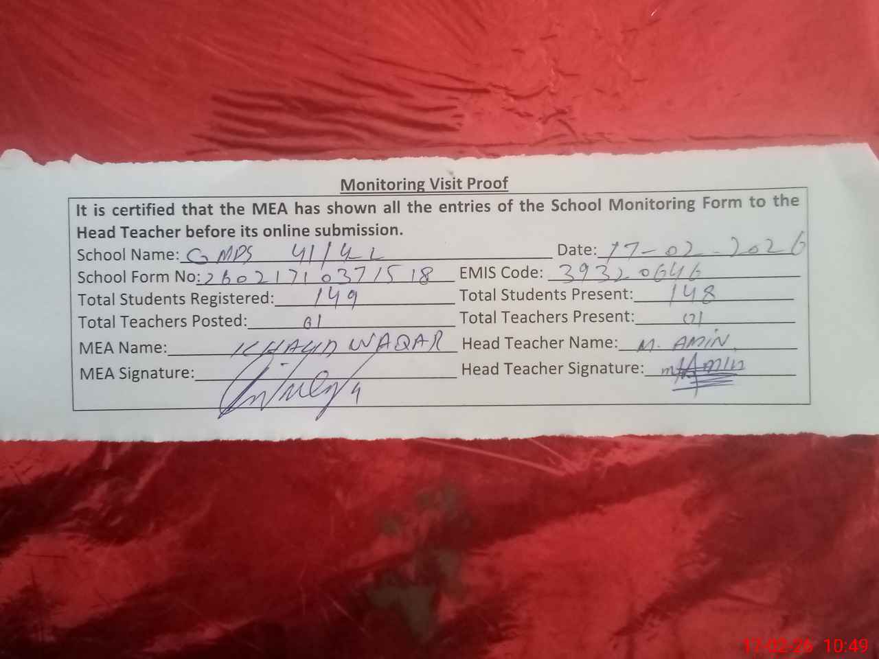 | Attendance Register | Head Teacher | MEA with School | Visit Proof |