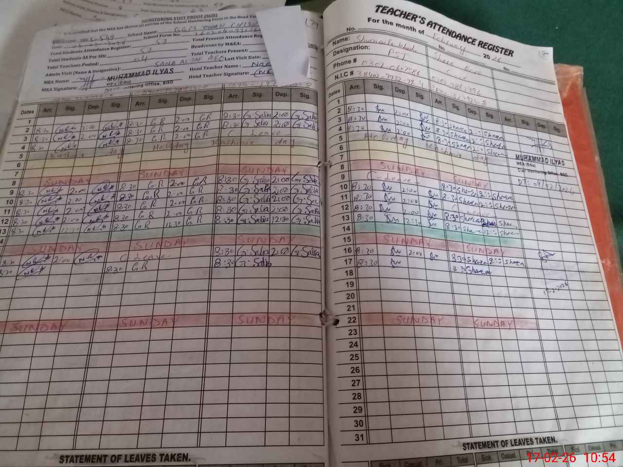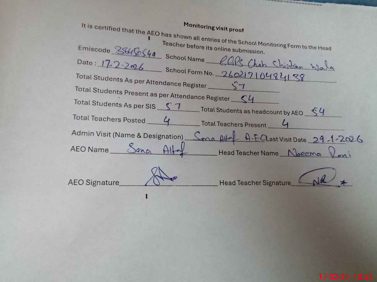 | Attendance Register | Head Teacher | MEA with School | Visit Proof |