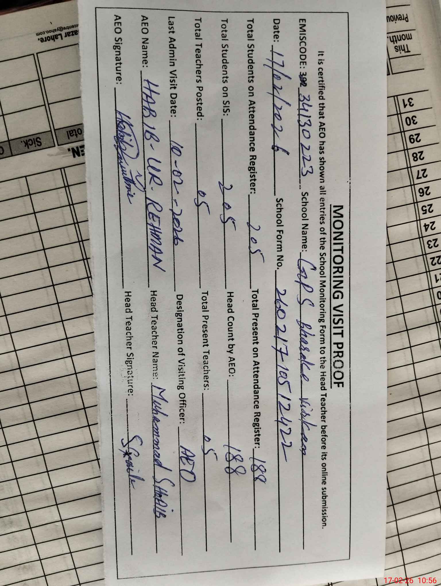 | Certified that this School was Inspected by the Undersigned MEA/DMO Today and the Information Stated Above is as Per Record. | |||||