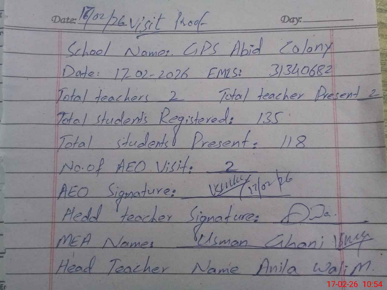 | Attendance Register | Head Teacher | MEA with School | Visit Proof |