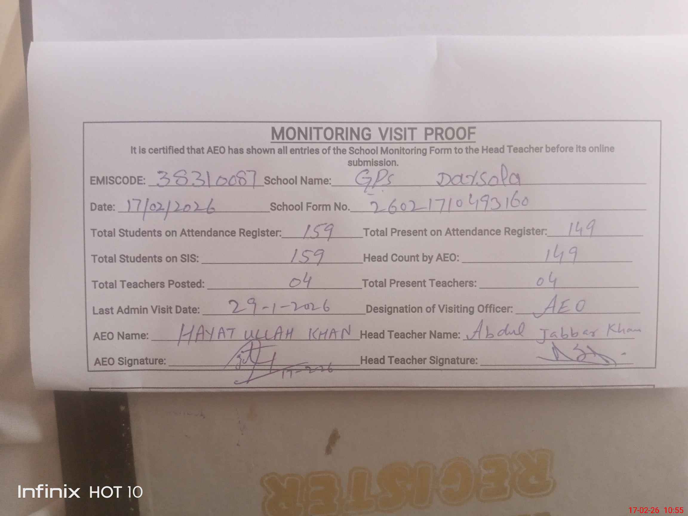 | Attendance Register | Head Teacher | MEA with School | Visit Proof |