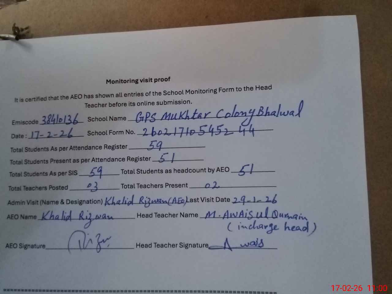 | Attendance Register | Head Teacher | MEA with School | Visit Proof |