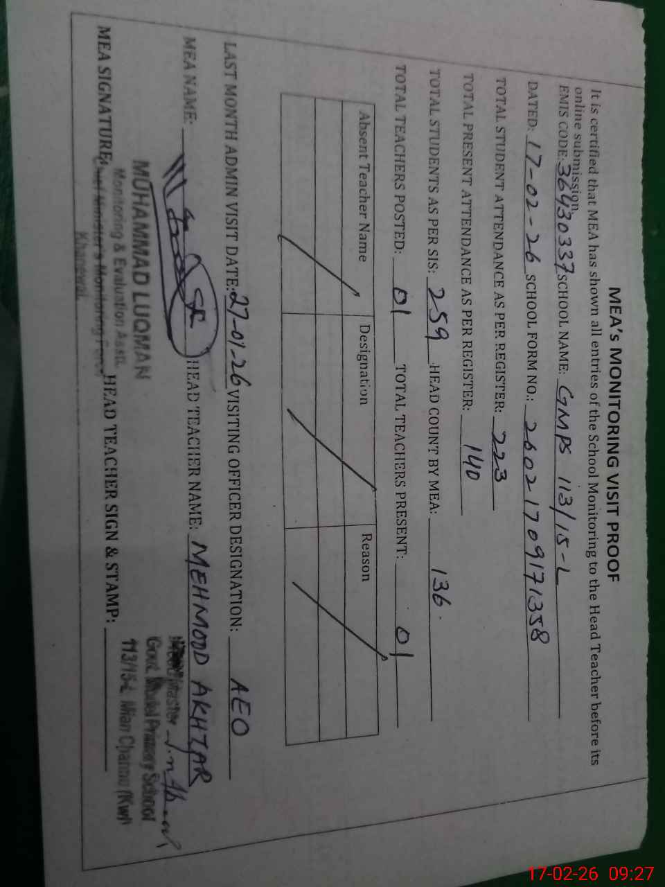 | Attendance Register | Head Teacher | MEA with School | Visit Proof |