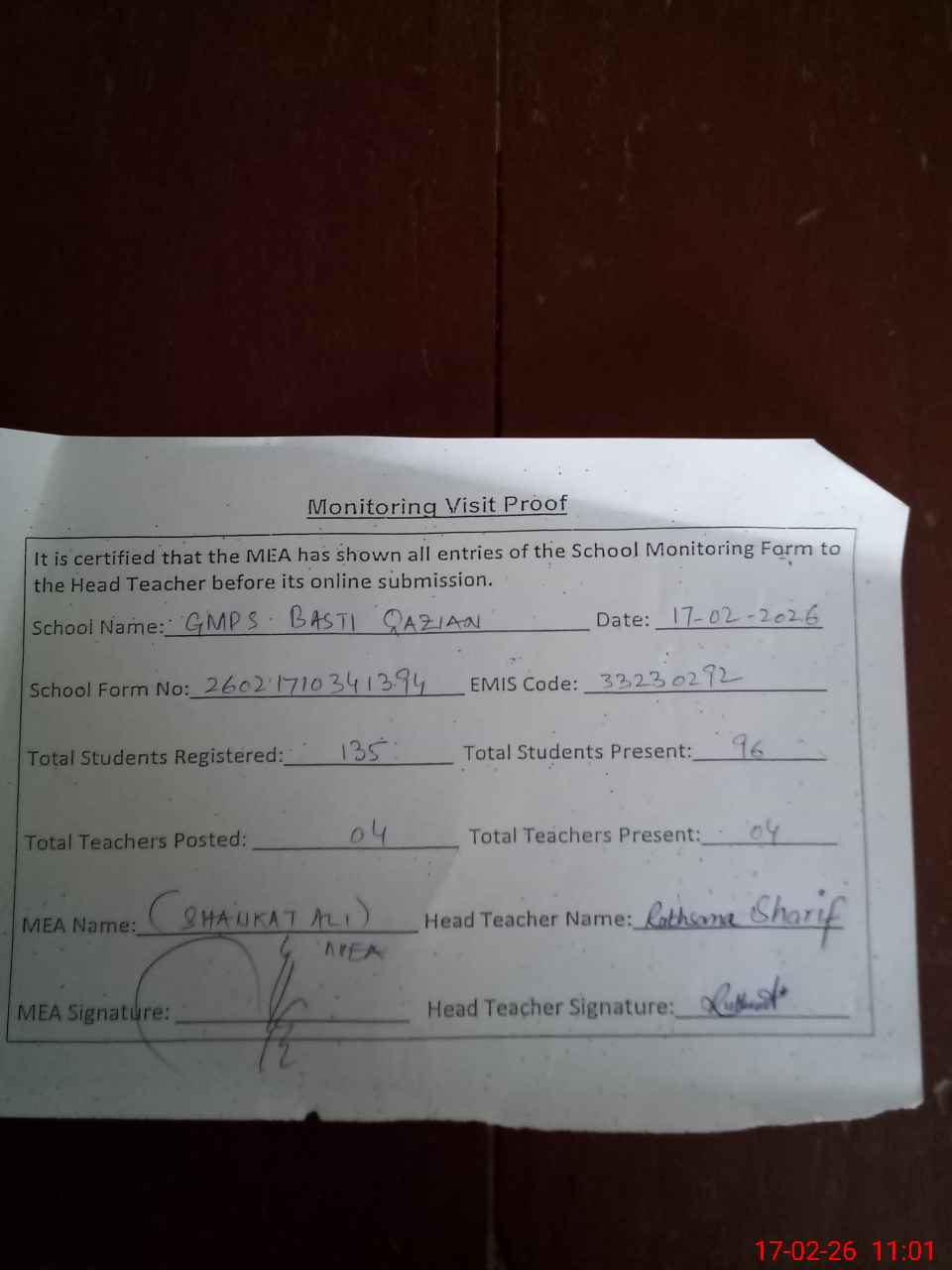 | EMIS Code: 33230292 | Name of School: GMPS BASTI QAZIAN | |||