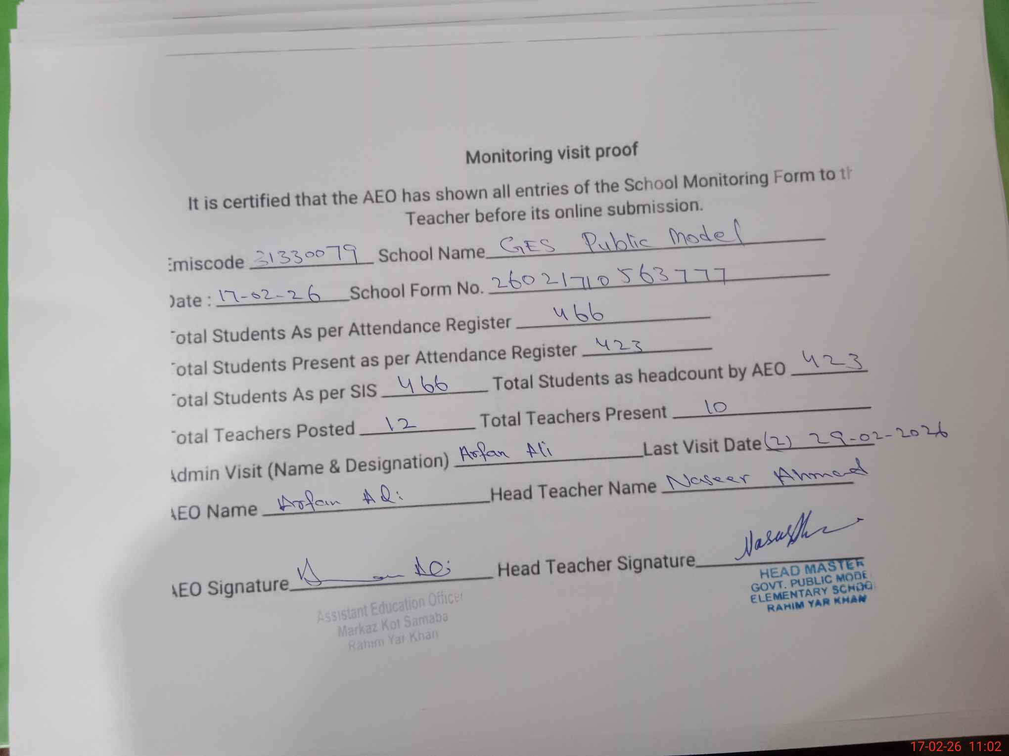 | Attendance Register | Head Teacher | MEA with School | Visit Proof |