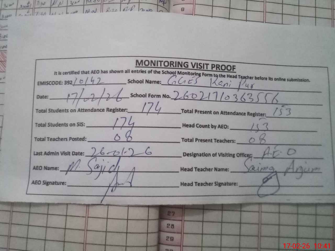 | Attendance Register | Head Teacher | MEA with School | Visit Proof |