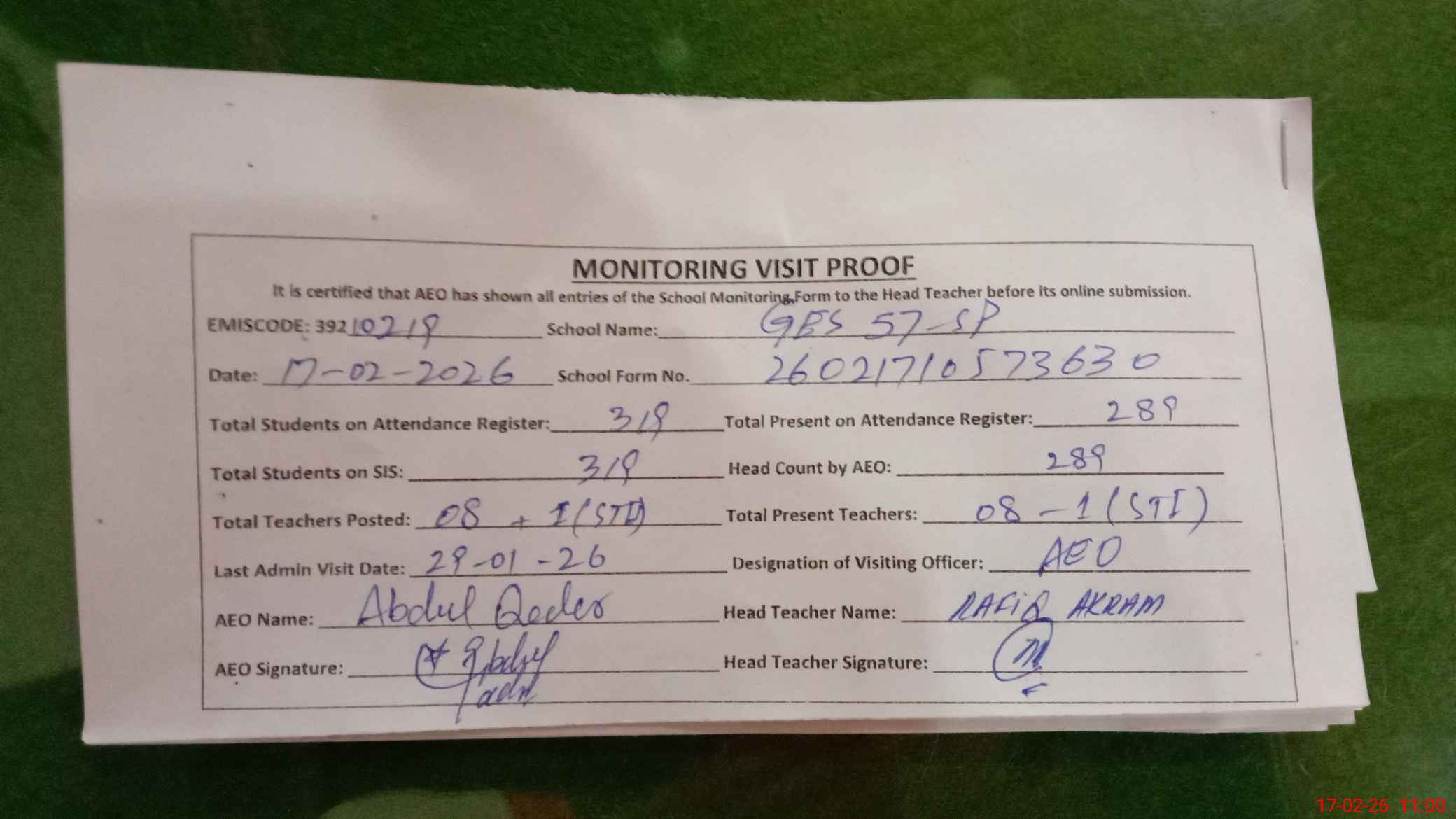 | Attendance Register | Head Teacher | MEA with School | Visit Proof |