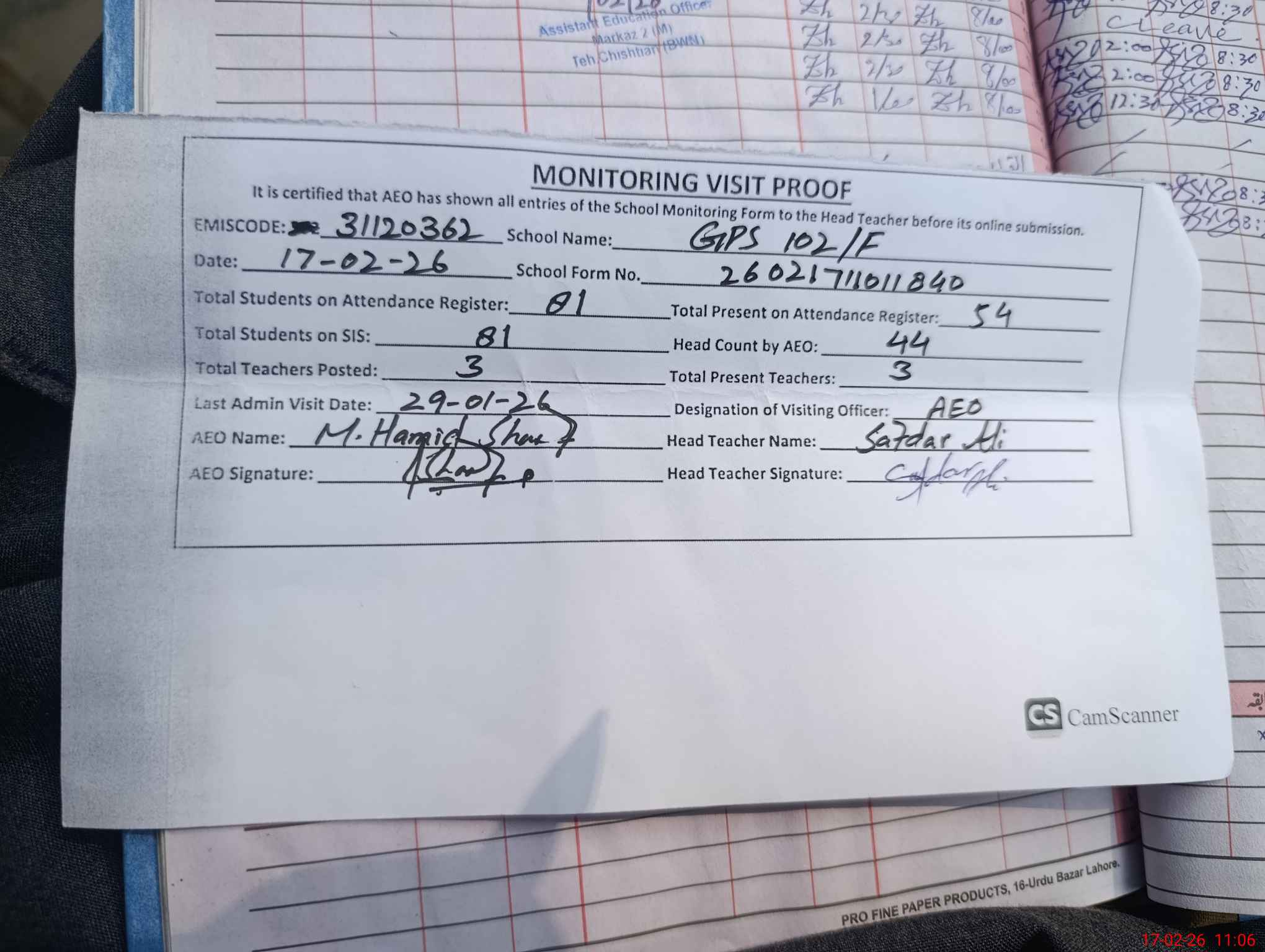 | EMIS Code: 31120362 | Name of School: GPS CHAK NO 102 F | |||