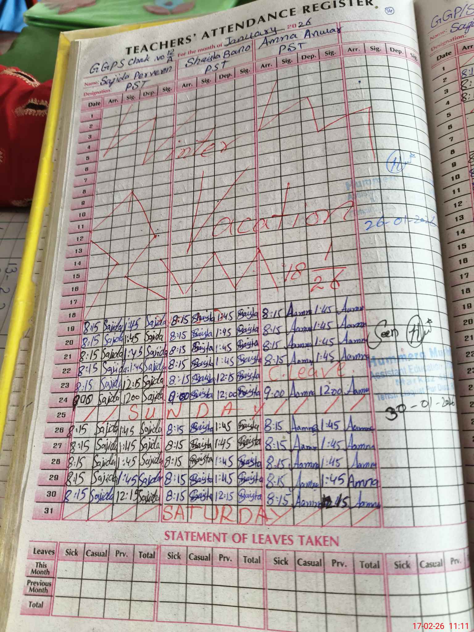 | Name: Sa**** Pa**** Designation: (School Headmaster's/Headmistress's) PST/PTC/JV Phone/Cell Number: 03**** |