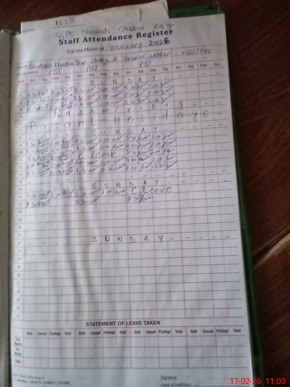 | CNIC | Full Name | Designation | R/C | Absence During Last Calender Month |