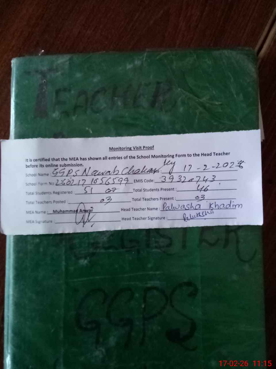 | Attendance Register | Head Teacher | MEA with School | Visit Proof |