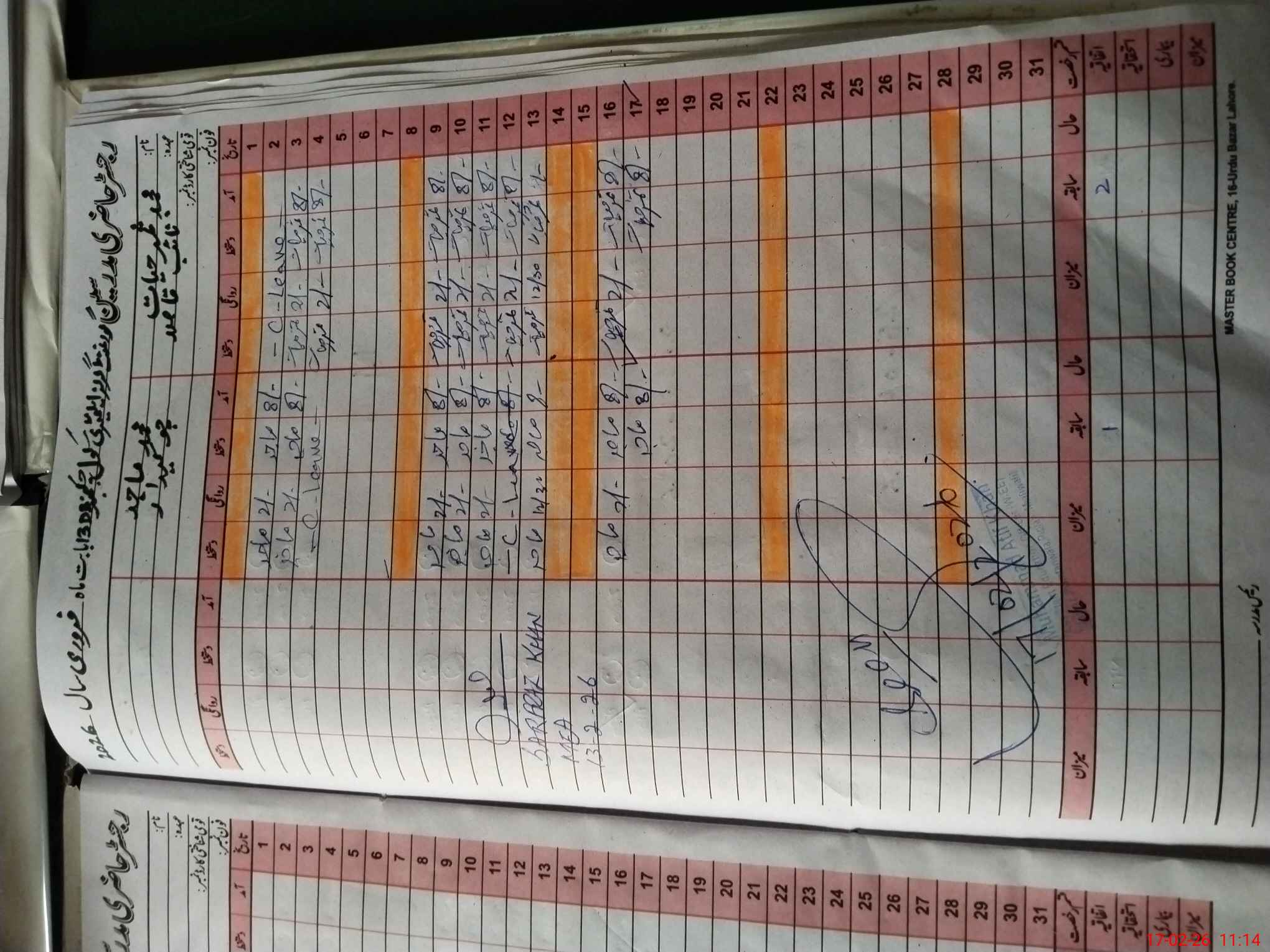 | CNIC | Full Name | Designation | R/C | Absence During Last Calender Month |