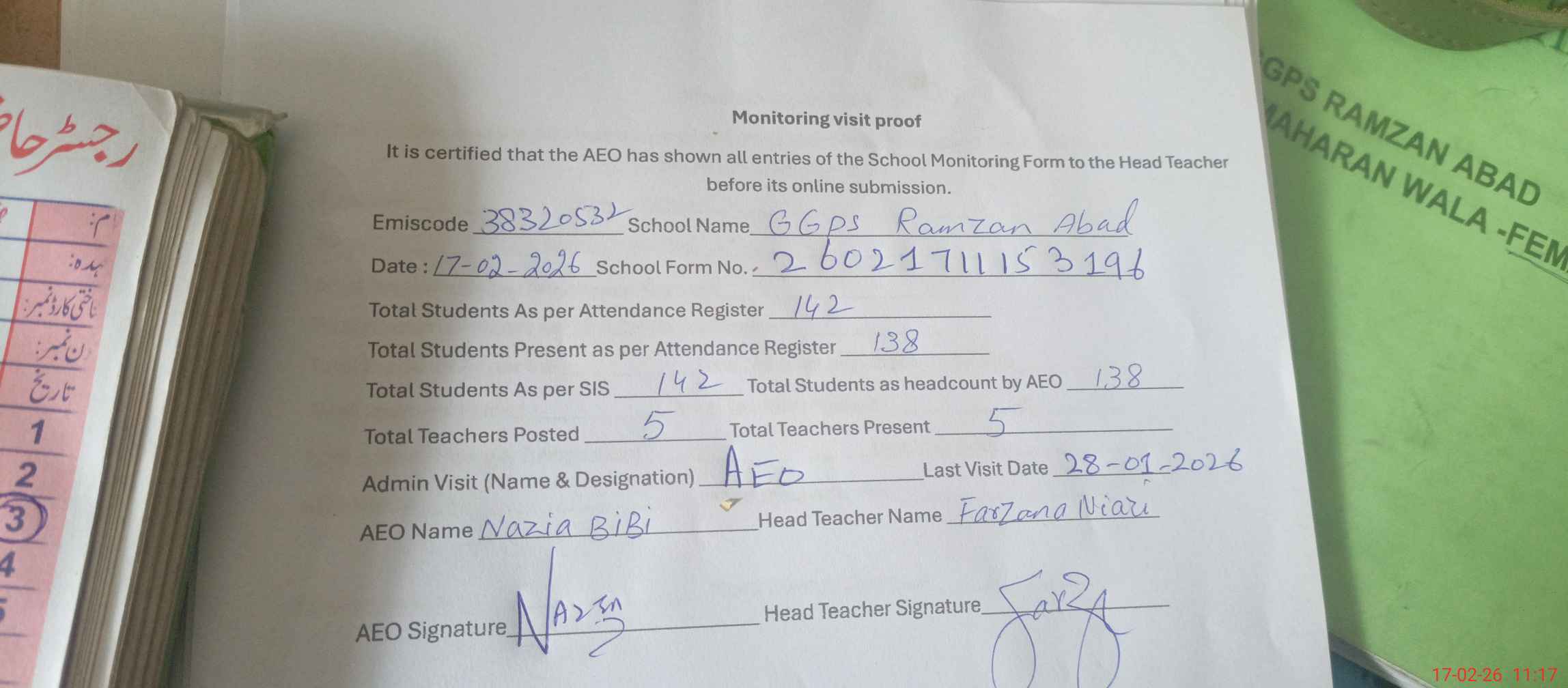 | Attendance Register | Head Teacher | MEA with School | Visit Proof |