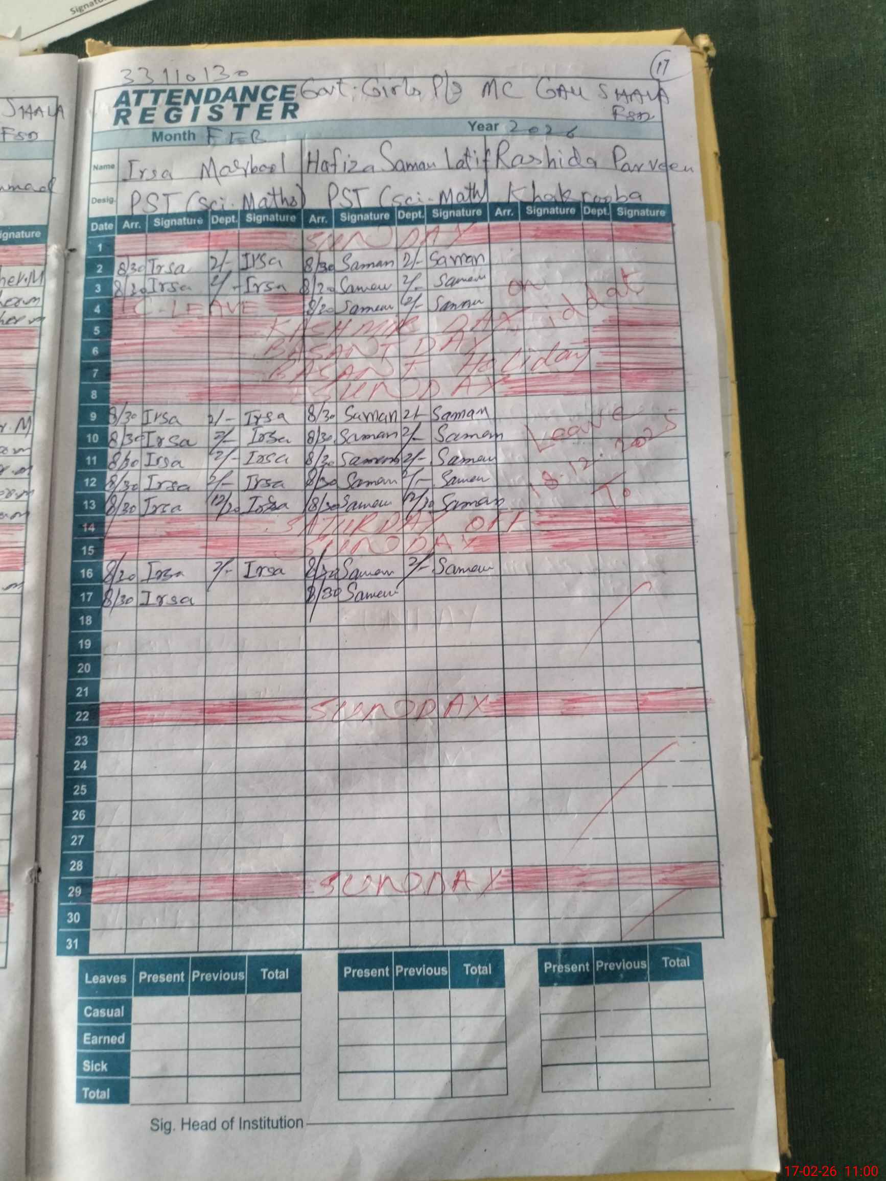 | Leave | Duty | Absent | Maternity | Medical | Ex- Pak |