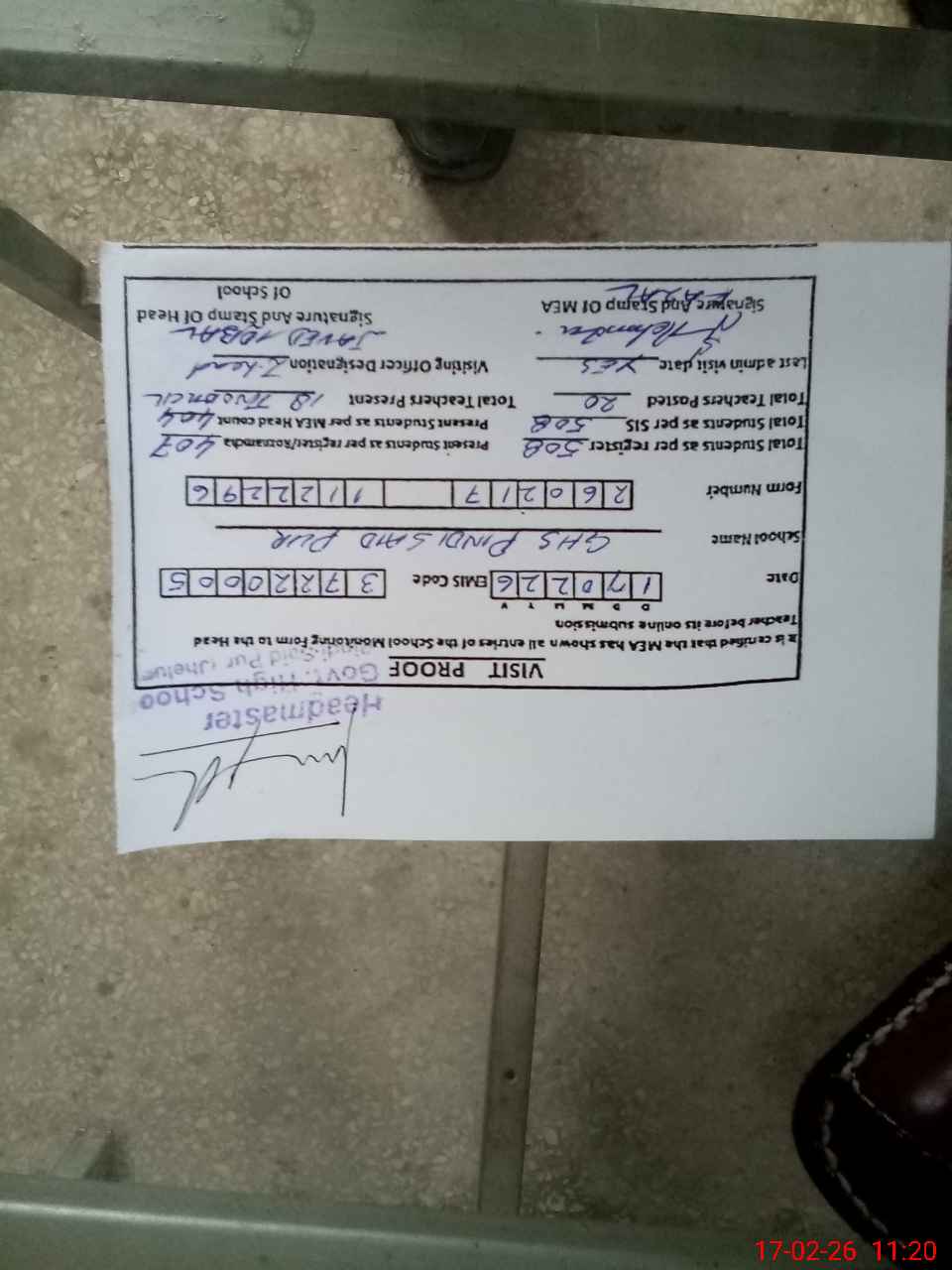 | Attendance Register | Head Teacher | MEA with School | Visit Proof |