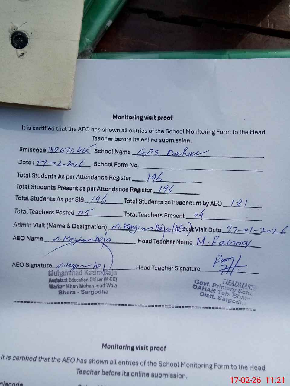 | Attendance Register | Head Teacher | MEA with School | Visit Proof |