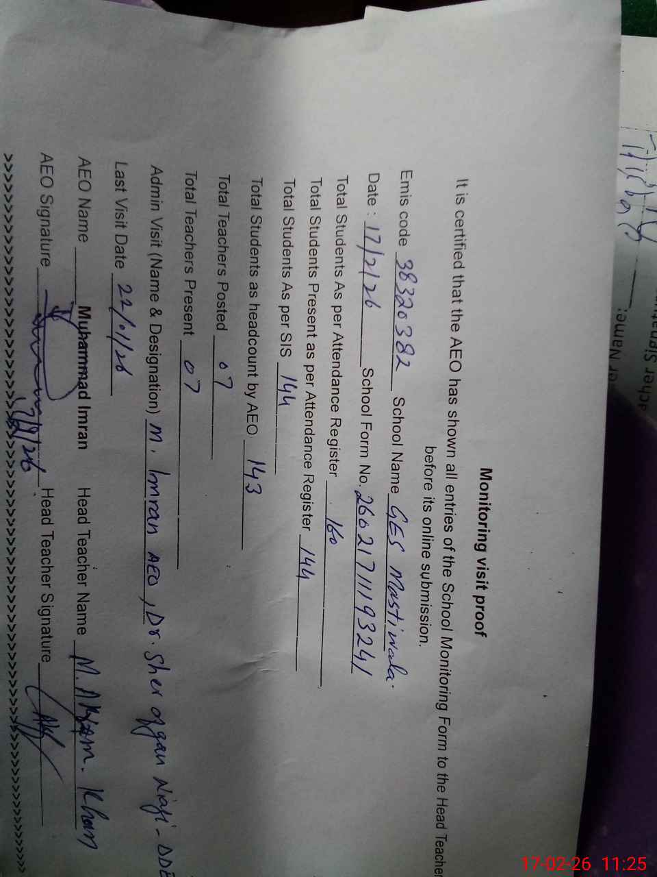 | Certified that this School was Inspected by the Undersigned MEA/DMO Today and the Information Stated Above is as Per Record. | |||||