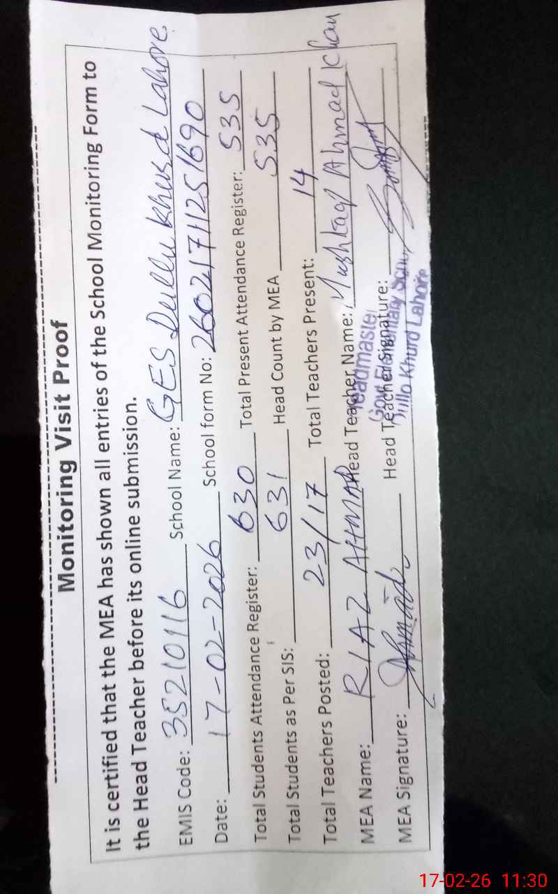 | Attendance Register | Head Teacher | MEA with School | Visit Proof |