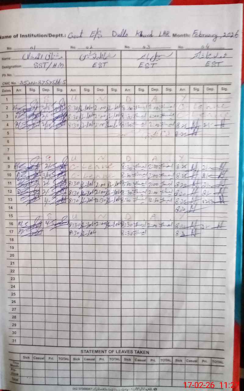 | CNIC | Full Name | Designation | R/C | Absence During Last Calender Month |