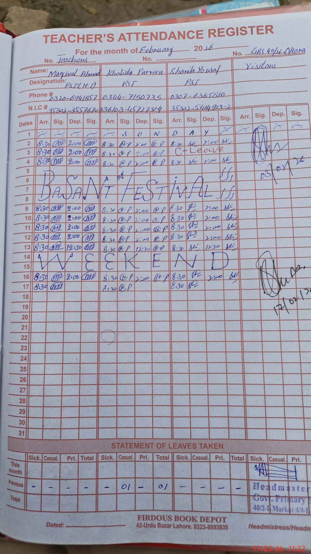 | CNIC | Full Name | Designation | R/C | Absence During Last Calender Month |