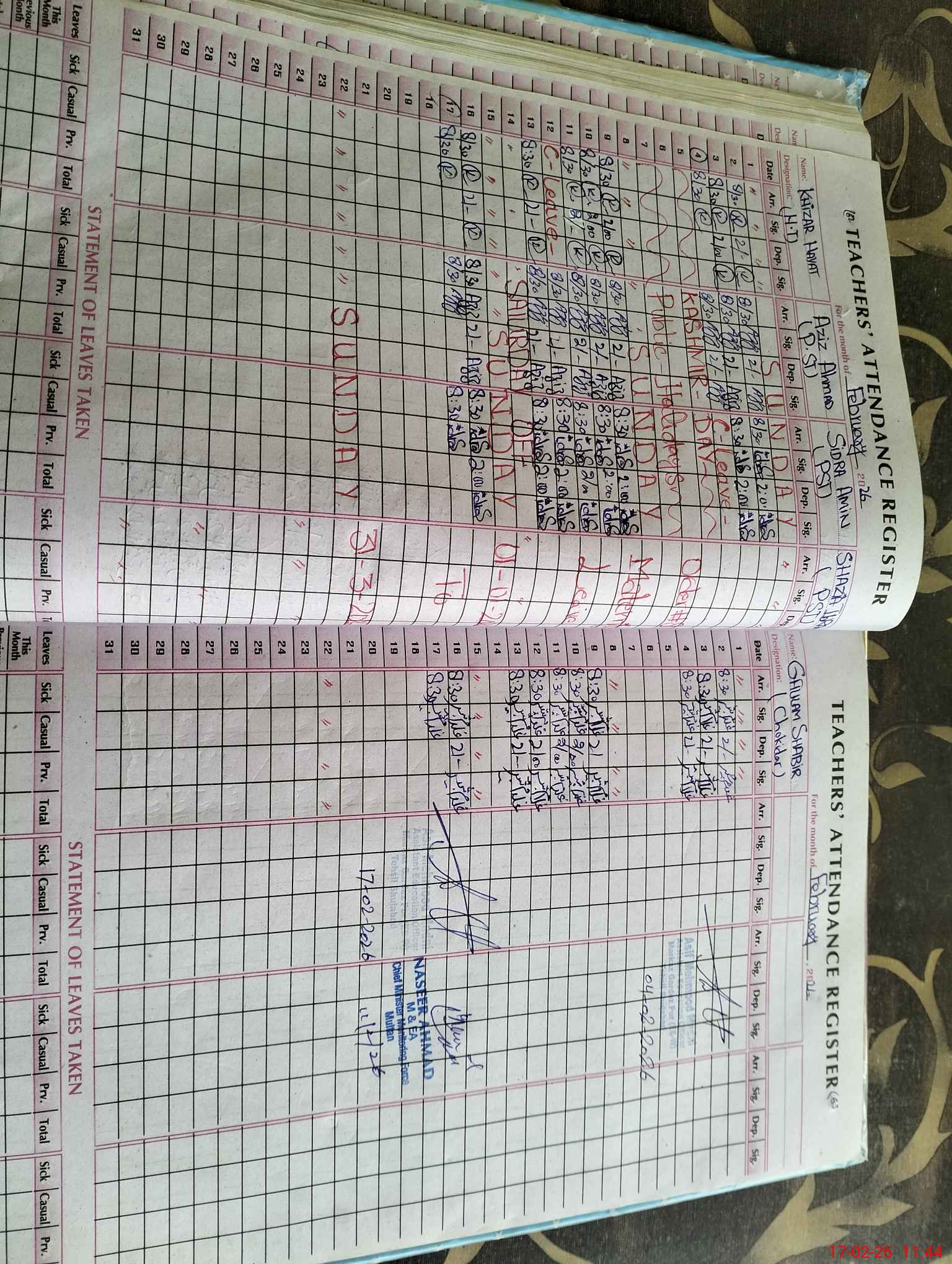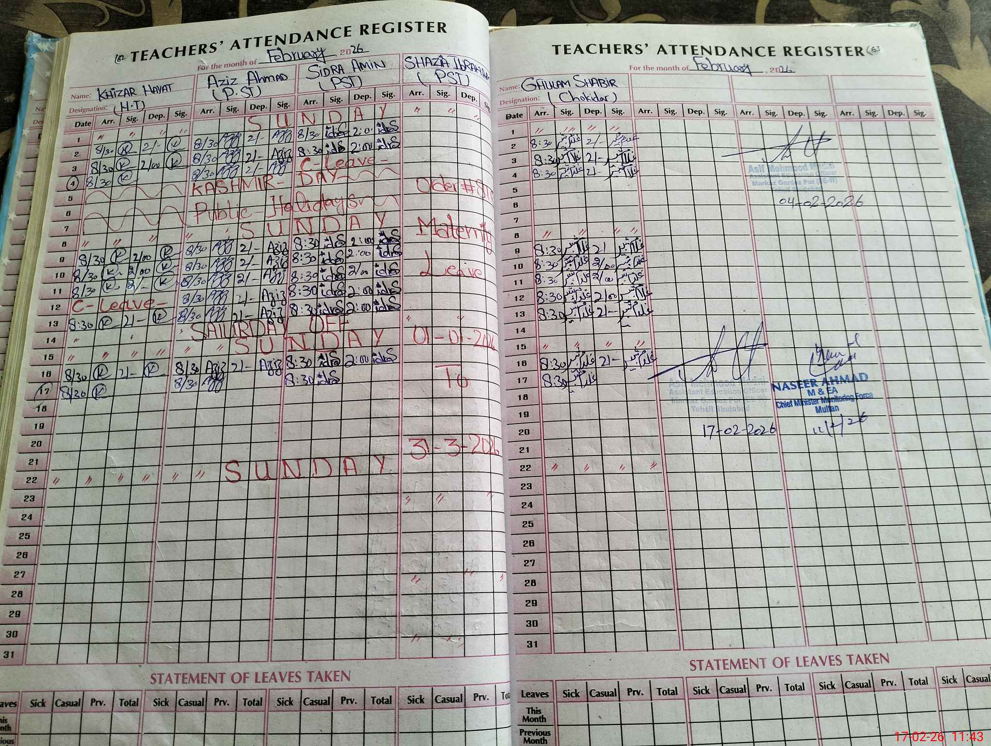 | Remarks (Use Separate Page if Required): Mis Shazia Ibrahim is on C-Leave from 1-1-2026 to 31-3-2026 | |||||