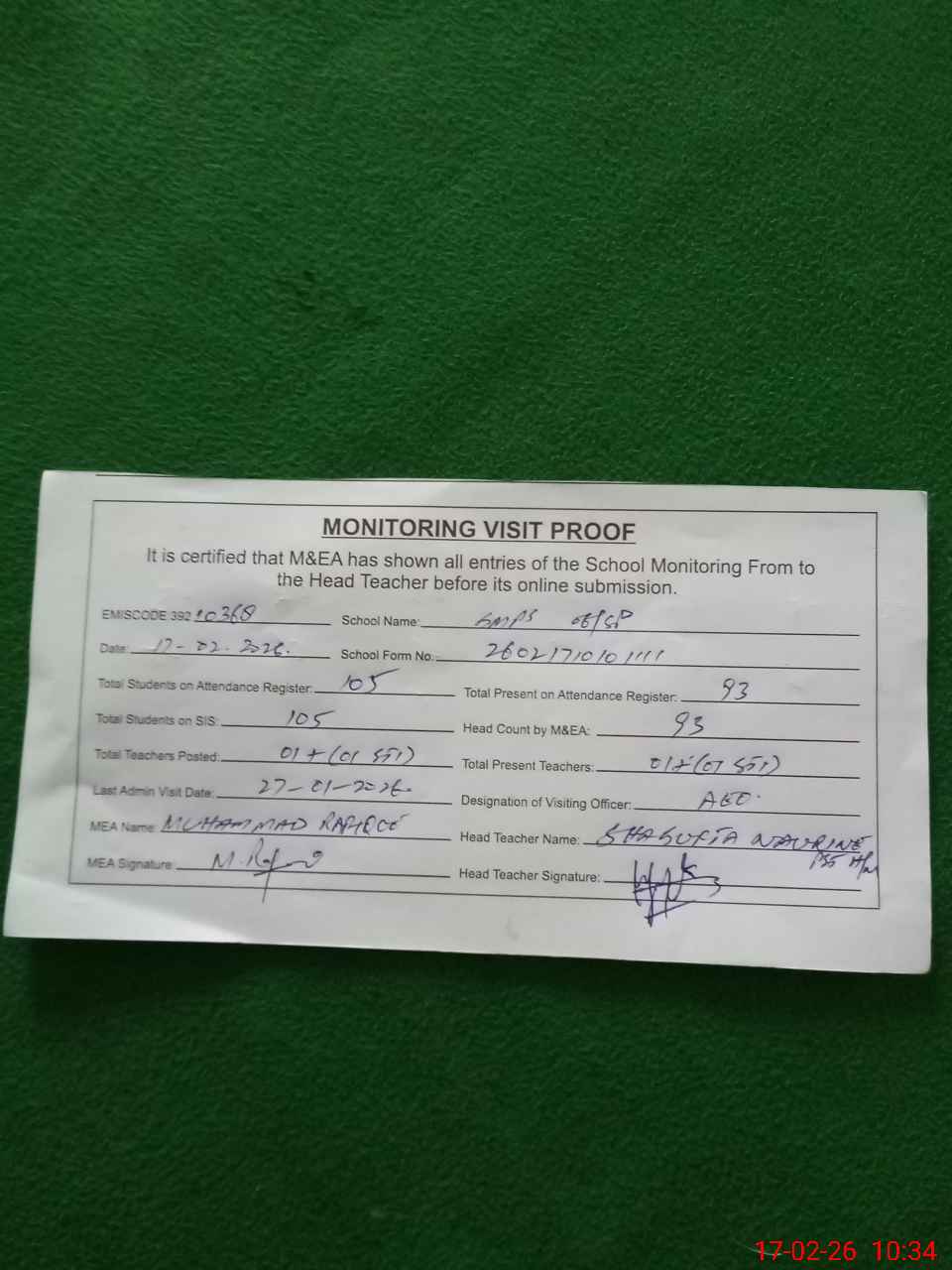 | Certified that this School was Inspected by the Undersigned MEA/DMO Today and the Information Stated Above is as Per Record. | |||||