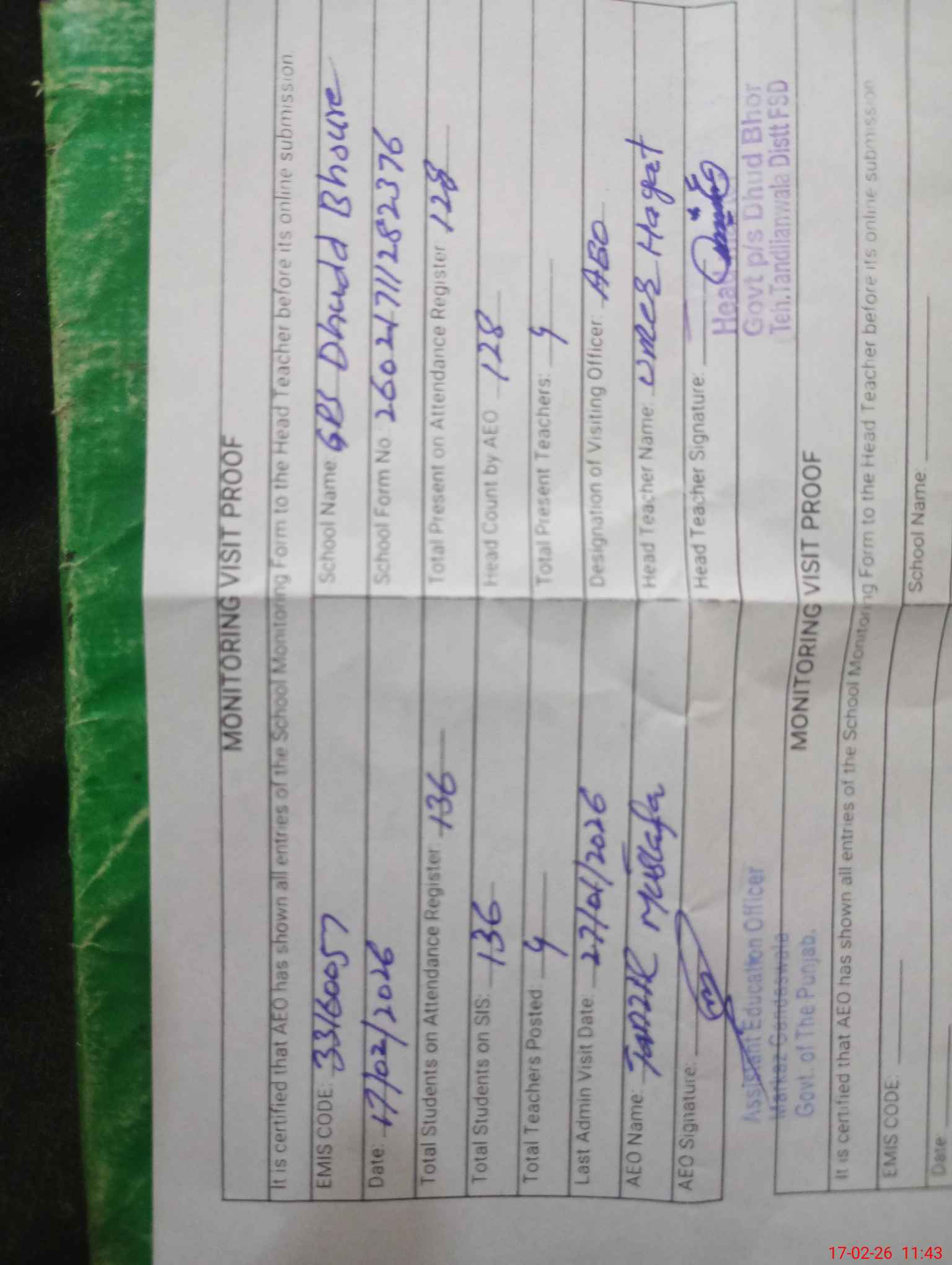 | EMIS Code: 33160057 | Name of School: GPS DHUD BHOUR TANDLIANWALA | |||