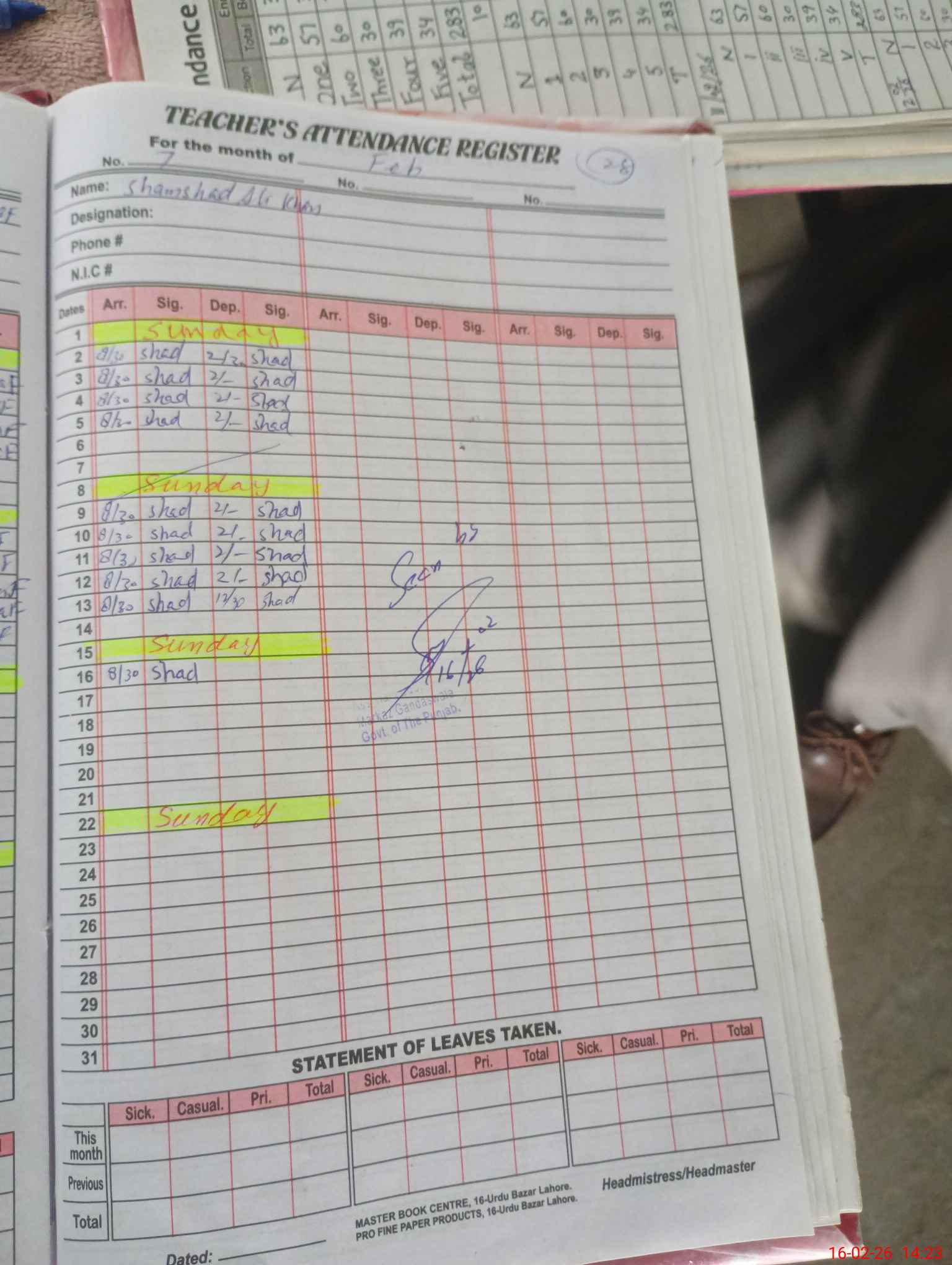 | CNIC | Full Name | Designation | R/C | Absence During Last Calender Month |
