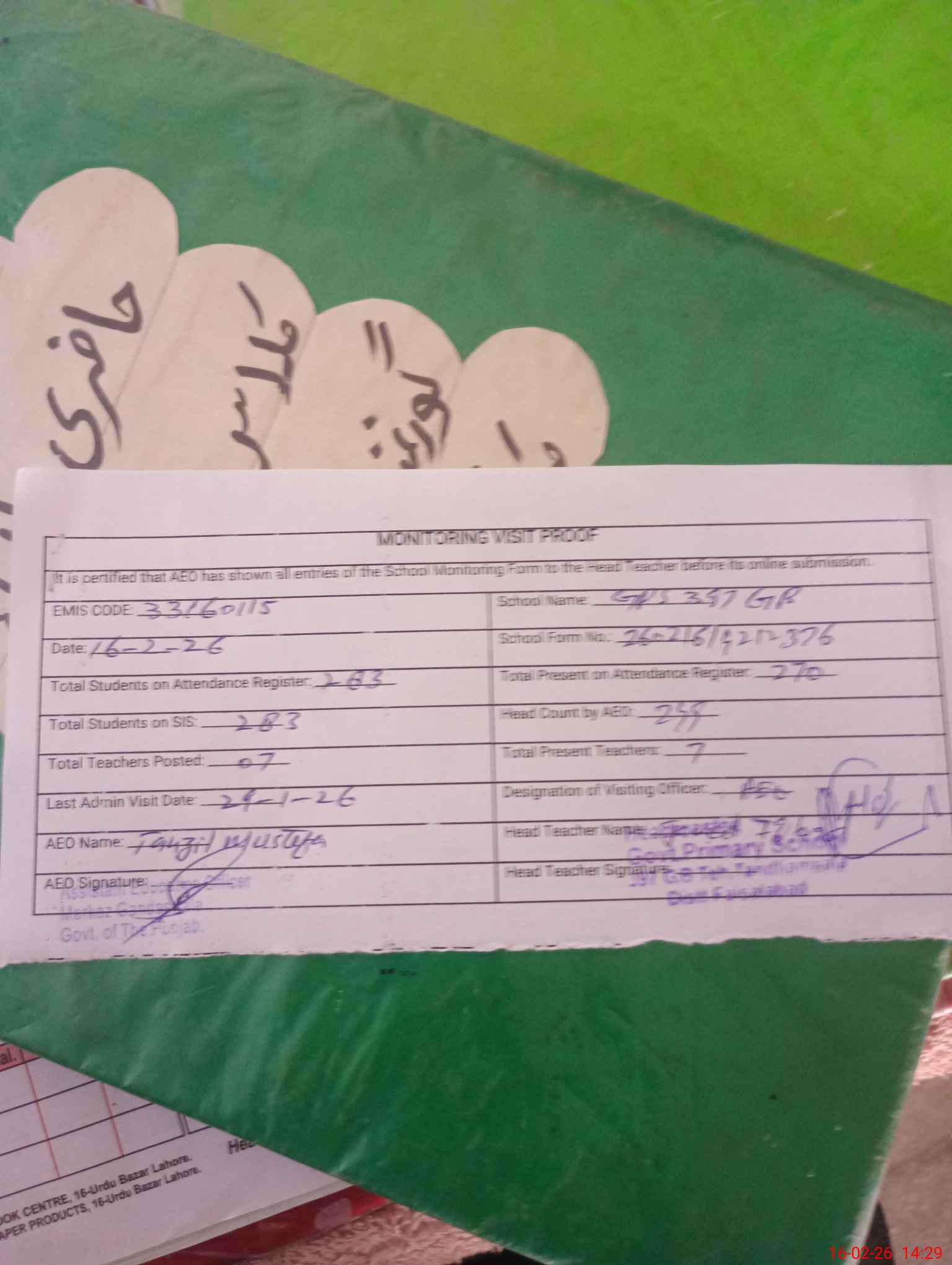| EMIS Code: 33160115 | Name of School: GPS CHAK 397 GB TANDLIANWALA | |||