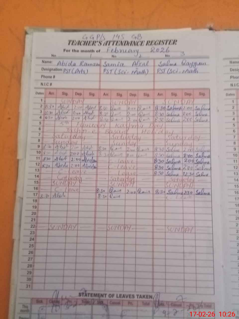 | CNIC | Full Name | Designation | R/C | Absence During Last Calender Month |
