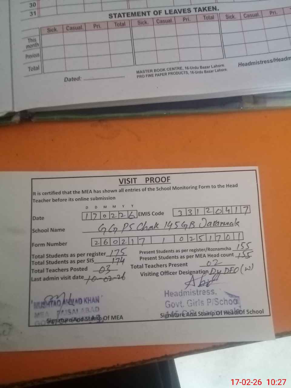 | Attendance Register | Head Teacher | MEA with School | Visit Proof |