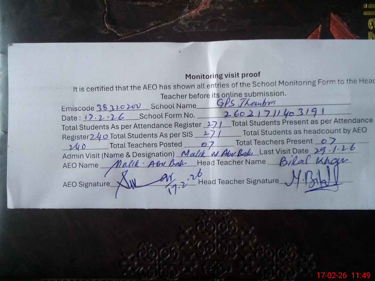 | Certified that this School was Inspected by the Undersigned MEA/DMO Today and the Information Stated Above is as Per Record. | |||||