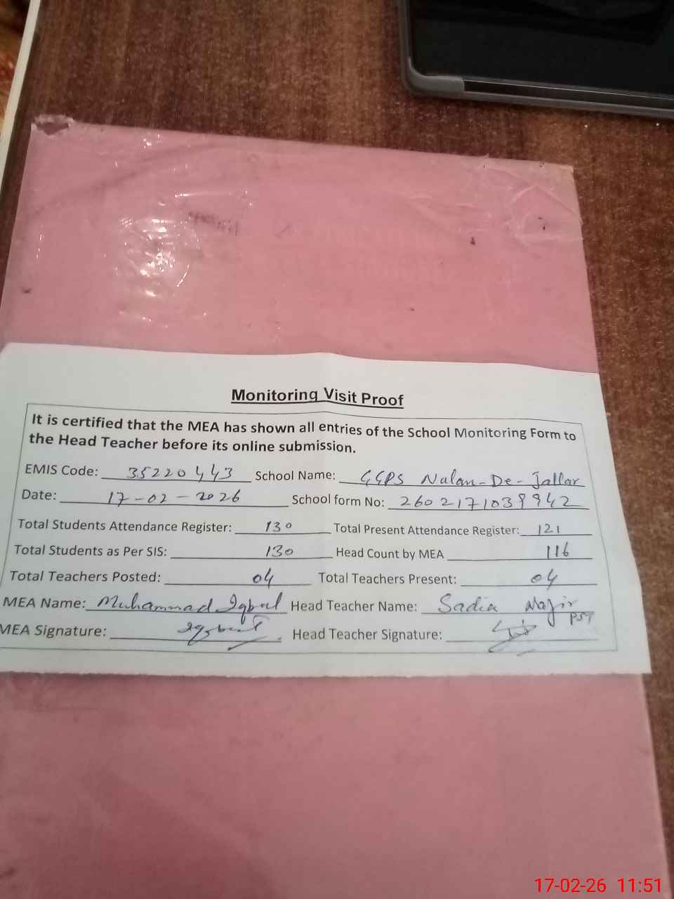 | Attendance Register | Head Teacher | MEA with School | Visit Proof |