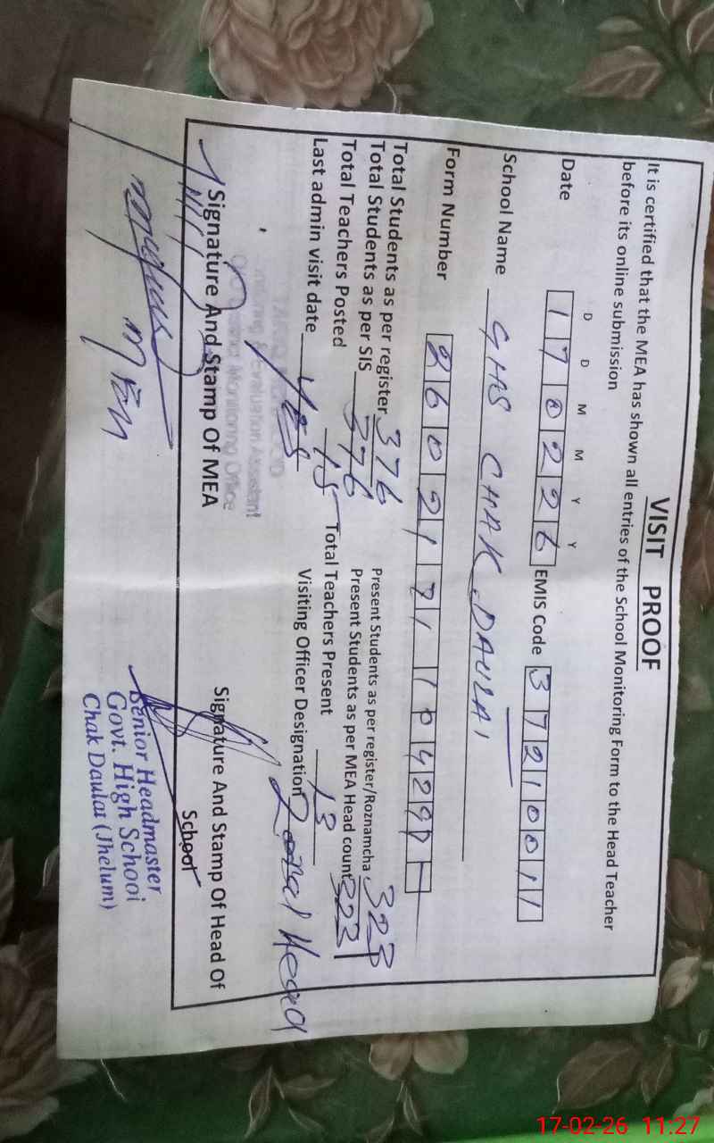 | EMIS Code: 37210011 | Name of School: GHS CHAK DAULAT | |||