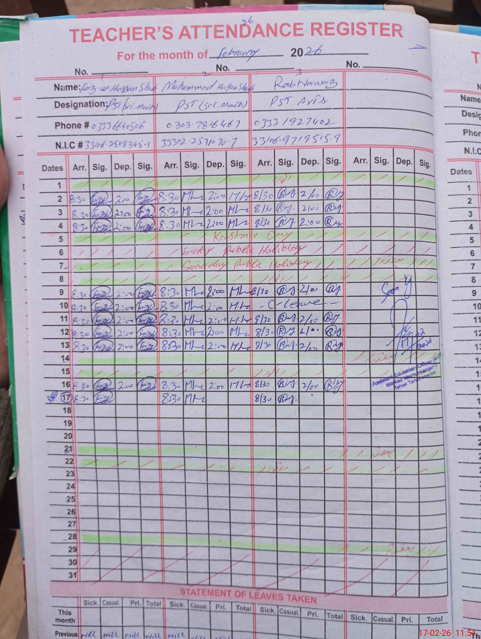 | Name: FA**** ULHA**** Designation: (School Headmaster's/Headmistress's) PST Phone/Cell Number: 03**** |