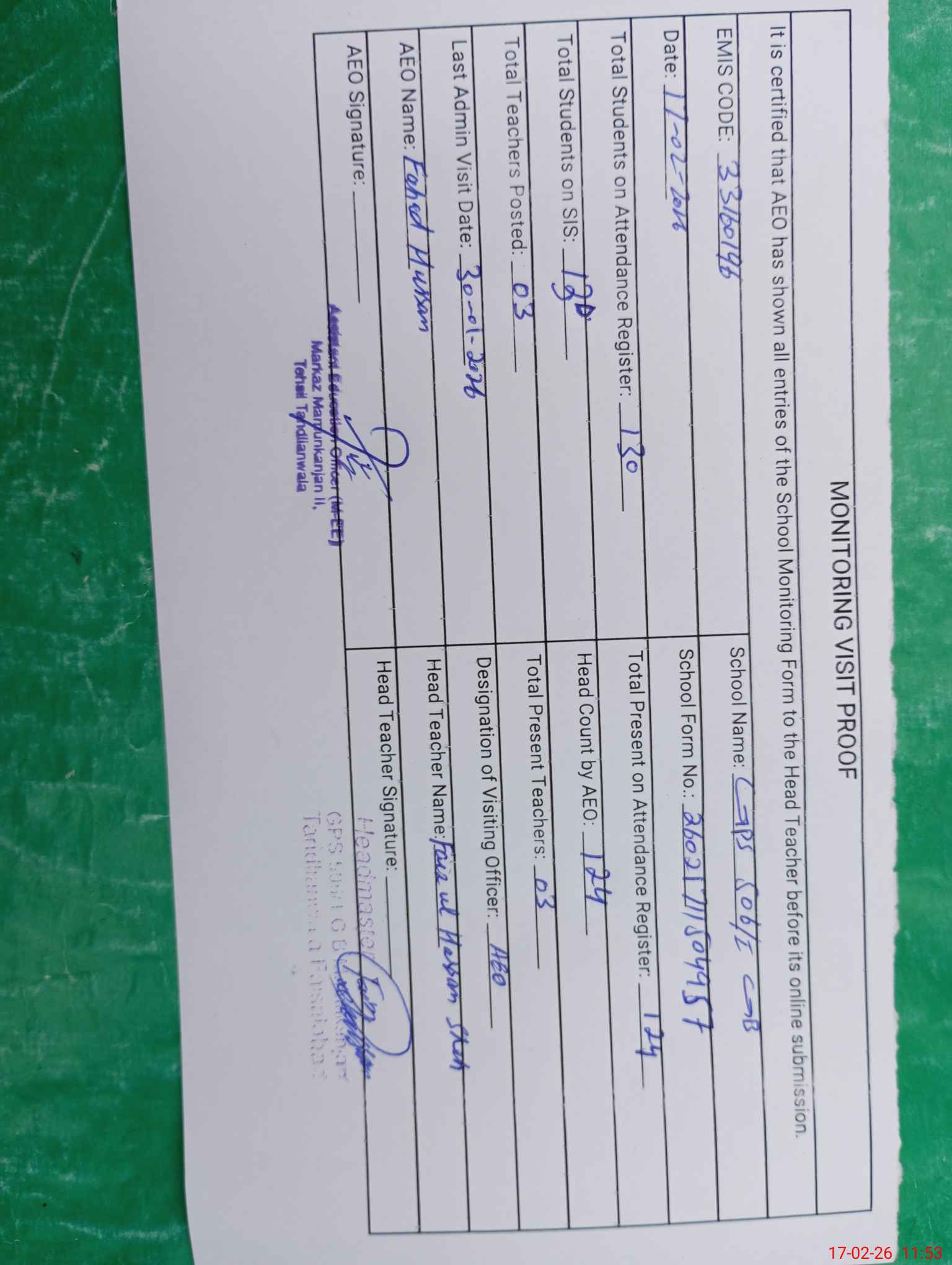 | EMIS Code: 33160196 | Name of School: GPS CHAK 506 GB I MAMUNKANJAN | |||