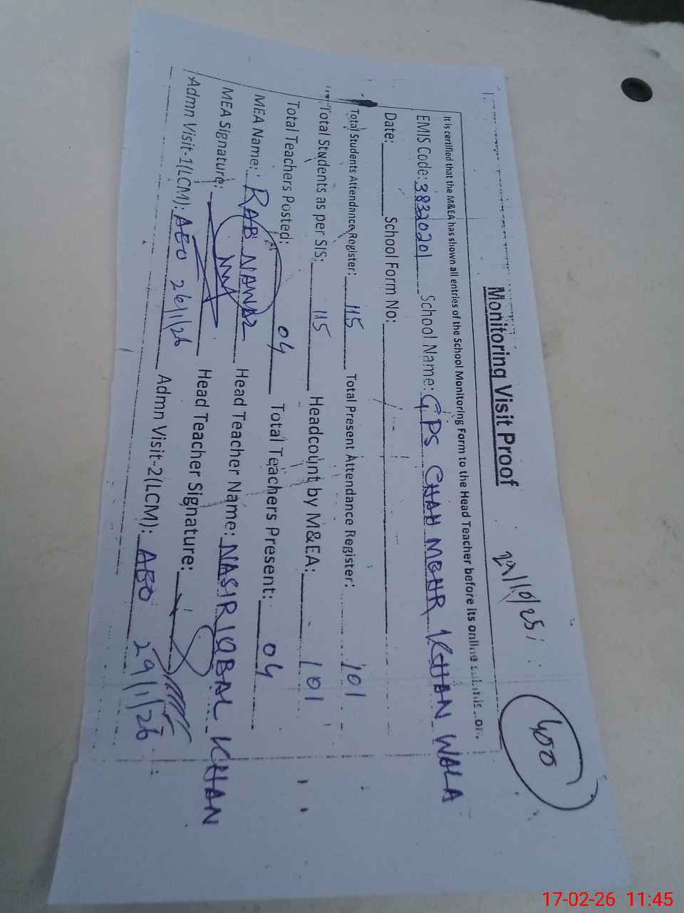 | Attendance Register | Head Teacher | MEA with School | Visit Proof |