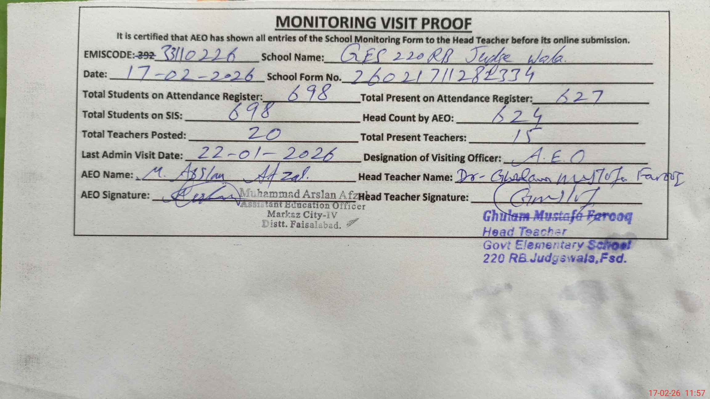 | EMIS Code: 33110226 | Name of School: GES CHAK 220 RB JUDGE WALA FSD | |||