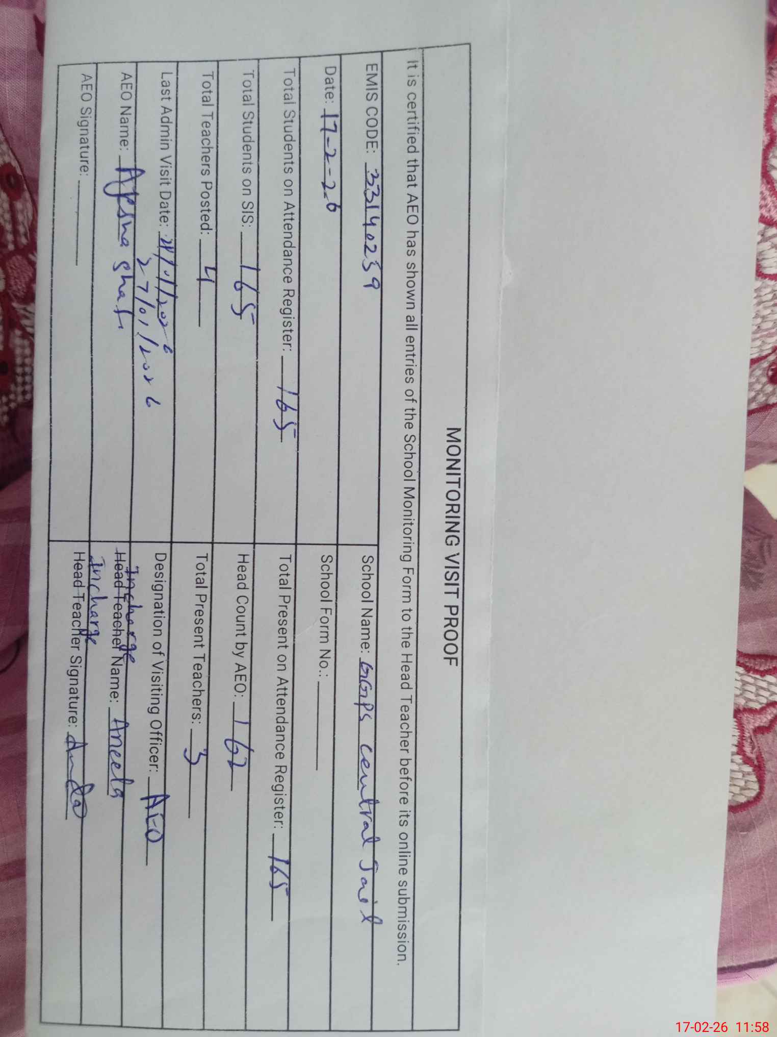 | Certified that this School was Inspected by the Undersigned MEA/DMO Today and the Information Stated Above is as Per Record. | |||||