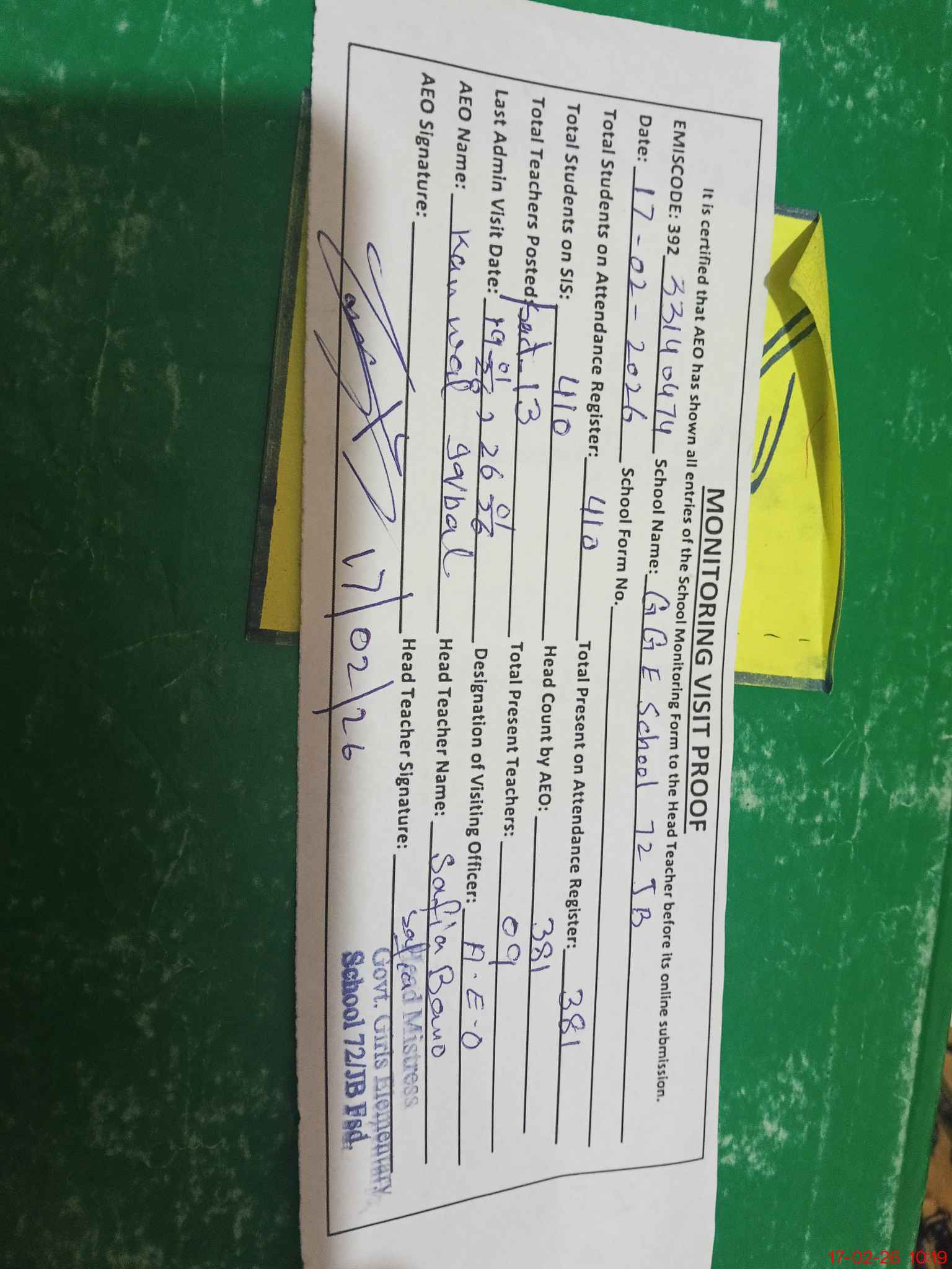 | EMIS Code: 33140474 | Name of School: GGES CHAK NO 72 JB | |||