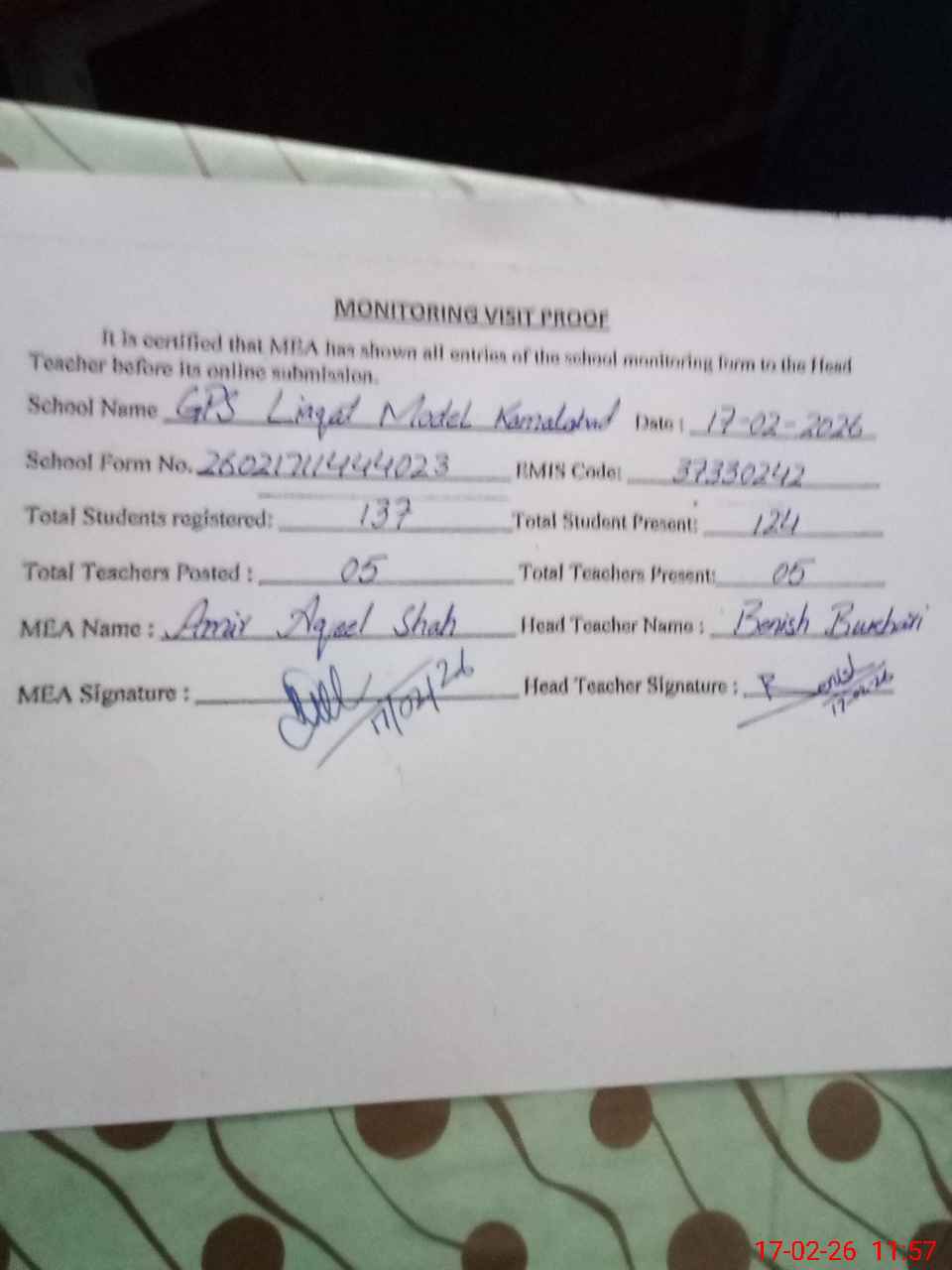 | Attendance Register | Head Teacher | MEA with School | Visit Proof |